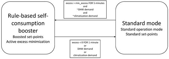 Thus, the expression for the self-consumption ratio, shown in Equation (3), is proposed. Its inputs are the minimum photovoltaic excess to activate the excess mode (