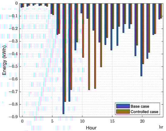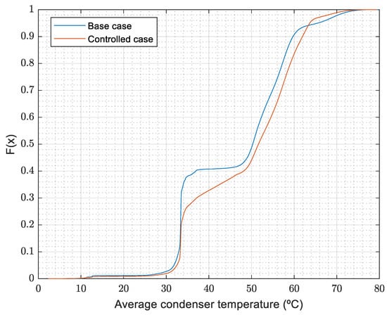 Figure 23 shows how the cumulative distribution of the mean temperature in the condenser (understood as the arithmetical average between the input water temperature and the output water temperature) is different for the base case and the controlled scenario. When the controller is enabled, it is more common to have condenser temperatures of around 32–50 °C, caused by the new set-points of the space heating mode. The effect of the new temperature for the DHW is not that remarkable though, mainly because the activations of the heat pump in that mode are shorter and are not long enough to reach a steady-state situation.