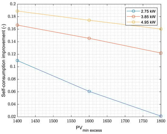 Figure 18, the improvements in self-consumption in Berlin for NHH are shown. First, it can be seen that the higher the minimum PV excess, the lower the self-consumption improvement is. This effect is derived from the non-self-consumed power as the activation criteria become stricter. In other words, if the minimum excess value is 1800 W instead of 1400 W, the rule-based controller is enabled for a shorter amount of time, which decreases the self-consumption of the system.