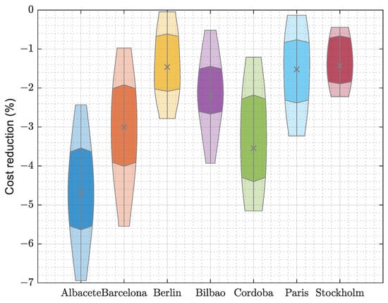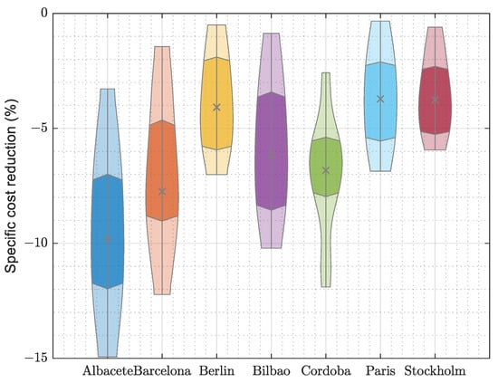 Figure 20. Comparing both the cost and the specific cost, the same trends can be derived: the larger reductions are obtained in Albacete (9.8%), while for the rest of the locations, reductions of between 3.8% and 7.8% are seen.