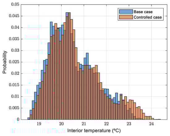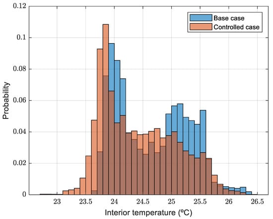 Figure 24 (winter months), temperatures between 23 °C and 24 °C are more common when the controller is enabled. When compared to the base case scenario, the probability distribution seems to be moved 1 K to the right-hand side. On the other hand, in