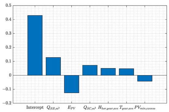 In addition, the cooling demand per unit area comes with a positive sign, as do the mean irradiation and temperature. Finally, the minimum PV excess value to activate the excess mode is introduced with a negative impact. That is, with large values, the self-consumption goes down, but its impact is smaller than the heating demand, for example.