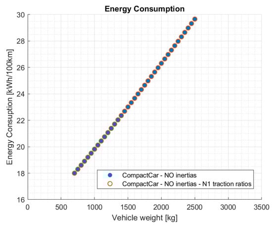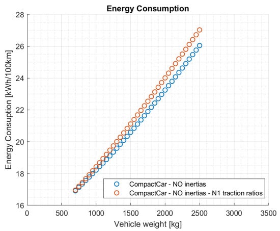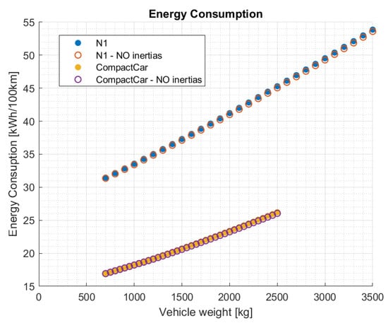 Initially, both vehicles (compact car and N1 vehicle) were considered equipped with a classic benchmark regenerative braking logic, with a trend as a function of time typically found in the literature [48,49]. In particular, the maximum possible regenerative torque is equal to 50 Nm for both vehicles, and the regenerative recovery begins when the accelerator pedal is released or, in any case, when the driver presses the brake pedal (and the accelerator pedal is not pressed), with a linear increment equal to 22.5 Nm/s. The simulations with vehicles equipped with a regenerative braking logic led to considerations (which we will see later) which meant that the analysis of the results of lightweighting was then carried out on the same vehicles, but without regenerative recovery under braking.