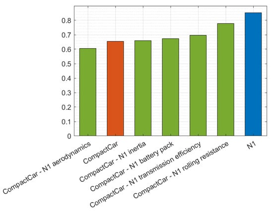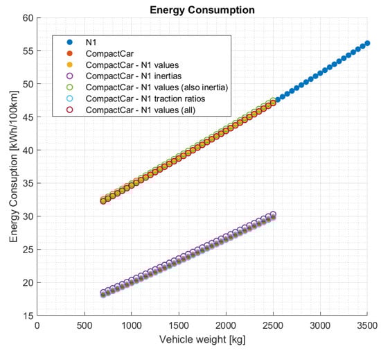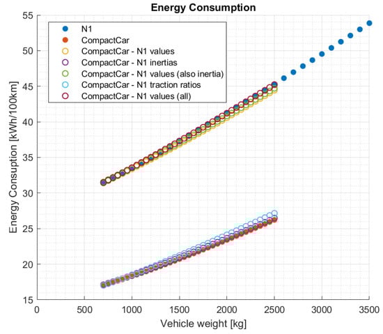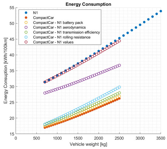 Further sets of simulations were also carried out, on the WLTC (class 3b) and US06 driving cycles, for the compact vehicle, in which one or more parameters of the vehicle under examination (the “CompactCar”) were replaced by the corresponding values relating to the N1 category vehicle. In fact, the contribution provided by lightweighting is often differentiated in the literature according to the vehicle class. In this study, we therefore wanted to analyze how the different parameters of the vehicle model affect the results of lightweighting in such a way as to disengage from the vehicle class and monitor which parameters lead to this differentiation.