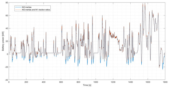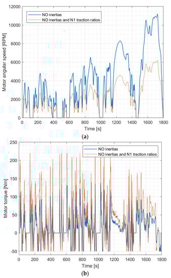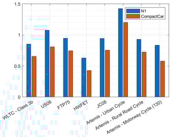 In particular, the N1 category vehicle is the vehicle adopted in [48] for the validation of the model with a low performance vehicle, but with a total vehicle transmission ratio equal to 6.22. Despite the modification of the transmission ratio, the vehicle in question fails to follow the standard driving cycles presented later for high vehicle weights (around 3500 kg). To exclude the variability of the results given by the limitations imposed by the maximum performance of the electric motor and the battery pack, appropriate measures have been adopted in order to avoid the occurrence of these limitations: an increase of the maximum motor torque and of the maximum current that can be supplied by the battery pack.