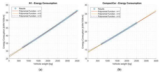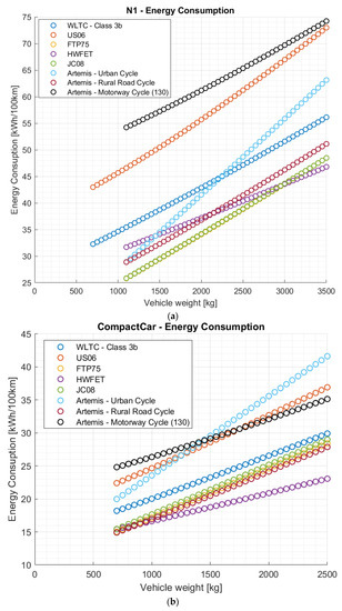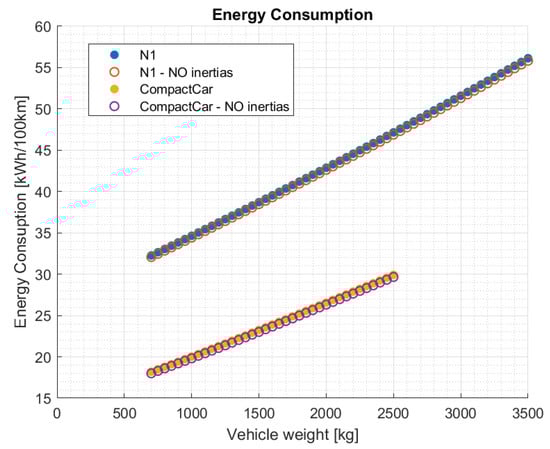 The objective of this research is to evaluate which are the parameters of the vehicle (and its model) that influence the results of lightweighting, all with reference to vehicle categories M and N1 [47]. For the analysis, various simulations were carried out with the model described in [48] (with the integrations described in [49,50]), for the estimation of energy consumption, on standard driving cycles, as the mass of the vehicle varies.