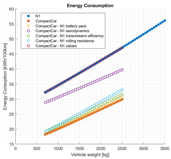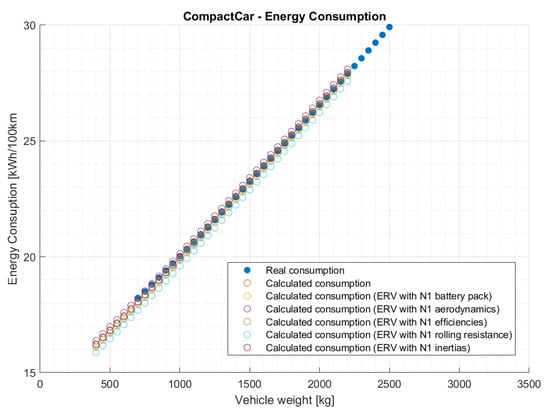 Finally, paper [46] focuses on electric vehicles to evaluate the results of lightweighting, proposing a methodology for calculating the ERV index. In addition, in the work proposed in our paper, we focus on electric vehicles and, therefore, it was decided to evaluate the effects of lightweighting based on the ERV coefficient instead of the FRV, considering the ERV index, expressed in kWh/(100 km ∙ 100 kg), to be more suitable and more comfortable, not having to refer to the equivalent liters of petrol or diesel which are not directly involved in electric traction.