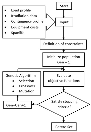 Investments in the PV/BESS contribute to increasing the availability index. Without investment, the system will be unavailable during contingency, and increasing the investments the value of A will increase to its maximum value (A = 1). At this point, if the investments are increased, the value of A will not change. As the TIPV/BESS is a mix of investments in the PV system and the BESS, there is a set of decision variables (PPV and PBESS) that give the lowest value of the investment and maximum value of A. This is a multi-objective problem where the optimal decision must be taken by the decision maker. Then, this problem can be classified as an a posteriori optimization problem [47,48]. Different algorithms are available to solve this kind of problem. Normal Boundary Intersection (NBI), Normal Constraint (NC), and Direct Search Domain (DSD) are examples of mathematical programming, and the Multi-Objective Genetic Algorithm (MOGA), Multi-Objective Particle Swarm Optimization (MOPSO), and Simulated Annealing (SA) are examples of evolutionary algorithms [49]. The MOGA is a metaheuristic optimization algorithm that emulates natural selection. In particular, the Non-dominated Sorting Genetic Algorithm II (NSGA-II) was employed to solve the proposed multi-objective problem, thanks to its ability to solve them by classifying the solutions according to the dominance degree [50]. This characteristic is explored in the literature in the study of microgrids [51,52,53,54,55,56,57]. The flowchart representing the GA algorithm is shown in Figure 5.