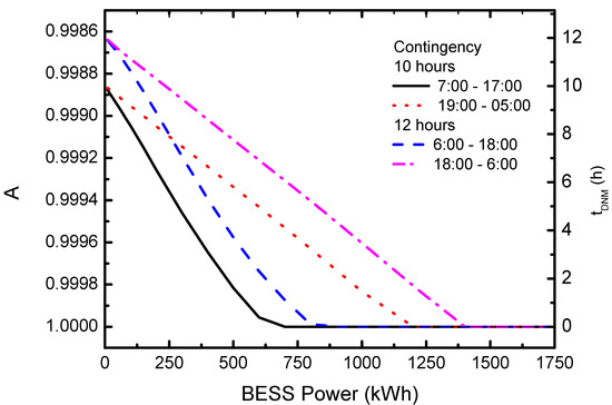 In this scenario, the energy supply to the auxiliary systems is considered to be provided only by the BESS, whose size is determined considering the load profile given in Figure 2 and different ranges and durations for the contingency. Depending on the BESS size, the availability index changes. It is observed that the availability index is equal to the unity when the BESS’s capacity is greater than 700 kWh and varies according to the contingency duration (10 or 12 h), whether it happens during the day (e.g., 6:00–18:00) or at night (e.g., 18:00–6:00), as shown in Figure 6.