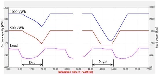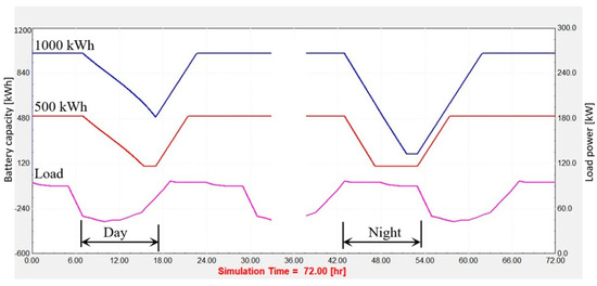 Temporal response of 1000 and 500 kWh batteries (blue and red lines) and the load profile (magenta line).