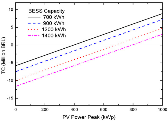 In this scenario, the power of the PV system able to compensate for the BESS investment, which occurs when TC is zero, was obtained for the lowest BESS capacity, ensuring an availability index of one (Figure 6). The results for the TC are shown in Figure 8 and were determined using the values given in Table 1.