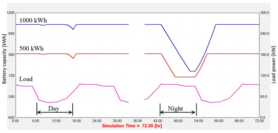 Temporal response of 1000 and 500 kWh batteries (blue and red lines) and the load profile (magenta line) connected with a 16.2 kWp PV system.