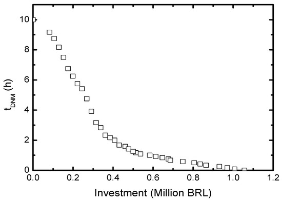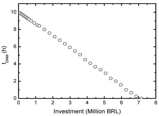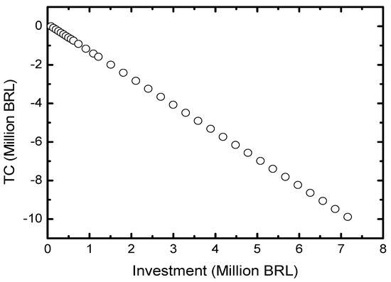 Even though the Pareto frontier for a contingency at night (Figure 14) shows the same conflict of objectives, the relation between tDNM and the investment is almost linear, and tDNM = 0 is achieved for about BRL 7.16 million. In this scenario, it is expected that the contribution of a PV system shall be null, which is observed in Figure 15, which illustrates the influence of the investment on the total cost. As the investment is increased by the acquisition of the BESS, the total cost becomes more negative, showing a linear trend, which means that all investments are in BESS and not in PV systems. In the case of zero hours for the demand not met, investments in BESS greater than BRL 7.16 million also give zero tDNM; however, these solutions do not contain one that represents the minimum investment and contributes to decreasing the total cost. Considering that it is necessary for a long number of charge/discharge processes to achieve the failure of the BESS during its lifespan, the obtained results are valid to attend to the number expected of contingencies per year [39].