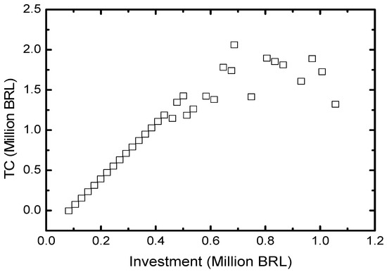 Total cost (TC) versus the investment for the scenario of contingency during the day. For comparison 1 USD = 5.1 BRL.
