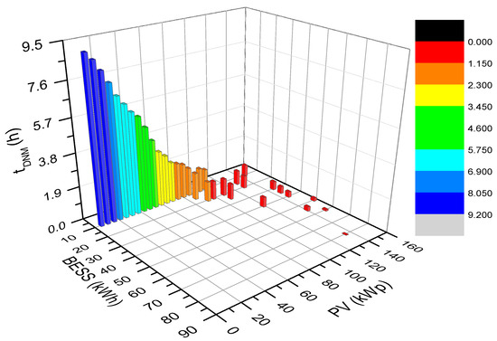 Simultaneous influence of PV power and BESS capacity on the time when the demand is not met (tDNM).