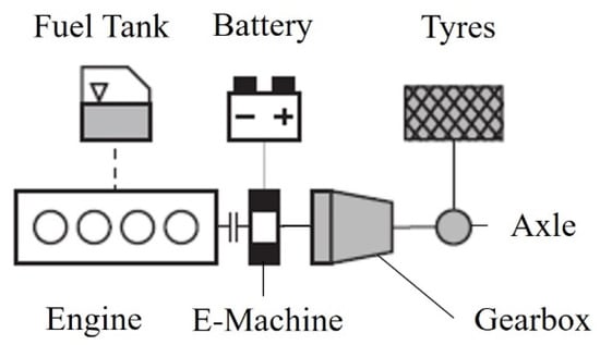 In the literature, several EMSs are documented that differ in their basic approaches and details. A common approach is to distinguish between optimization-based and heuristic EMSs [3]. Within the optimization-based approaches, a distinction can be made between global-optimal and local-optimal functionality. Global-optimal EMSs require a priori knowledge of the complete driving cycle. Often, the mathematical optimization of Dynamic Programming (DP) by [4] is applied to formulate and solve the optimal control problem of HEVs [5,6]. Another approach is based on the Pontryagin Maximum Principle (PMP), where the Lagrange multiplier transfers the electrical energy of the battery into an equivalent amount of fuel [7]. EMSs based on local-optimization methods do not consider the whole driving cycle a priori but only the conditions of the powertrain in the current driving situation. One approach is the Equivalent fuel Consumption Minimization Strategy (ECMS), which can be derived from PMP. Similar to the Lagrange multiplier, an equivalence factor is used to consider and optimize the overall efficiency of the powertrain [8]. The tuning of this equivalence factor is the scope of several research papers [9,10]. The state-of-the-art EMS implemented in HEVs for real-time application is the heuristic approach based on rules (RB). These rules determine the switch between the different operating modes based on the conditions of the powertrain. They can be defined in characteristic diagrams or tables, or as a state machine [11]. The parameterization of the rules can be done by observations of the optimal system behavior [3,12,13]. For a detailed overview of EMSs and their implementation, see [14,15,16,17,18]. To obtain high quality in an EMS, the specific boundary conditions of the target vehicle should be considered during its development process.