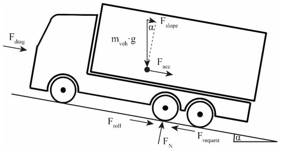 The longitudinal dynamics of the vehicle are illustrated in Figure 2. The powertrain of the vehicle must overcome the resistance forces resulting from rolling friction, of the aerodynamic drag and acting on the vehicle from the road slope α. In addition, acts in situations where the vehicle is accelerated by the powertrain. The vehicle mass affects all resistance forces other than the aerodynamic drag. The sum of these resistance forces multiplied with the dynamic tyre radius determines the required torque at the wheel in the current driving situation (1)–(5).