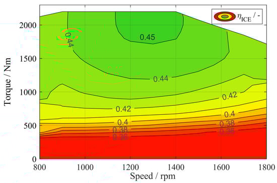 The engine is modelled based on a steady state engine map as shown in Figure 3. The efficiency of the engine is then taken from the engine map based on the torque of the engine and the engine speed (7). The resulting fuel mass flow is attained by the lower heating value of the diesel fuel and the angular velocity of the ICE (8).