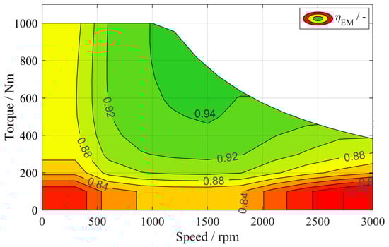 Analogous to the combustion engine, the competent model of the electric machine (EM) is also based on an efficiency map, as shown in Figure 4. Next to the efficiency losses of the electric machine itself, the losses of the inverter are included. The efficiency map is again a function of the torque and the speed of the electric machine . The conversion from mechanical power to electric power is dependent on the direction of the energy flow as stated by (10). Here, the angular velocity of the EM and the torque are used for the calculation of the power.