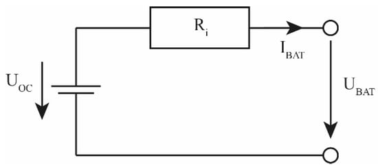 The battery is modelled based on a zero-dimensional equivalent circuit, as shown in Figure 5. The terminal voltage can be determined by formulating Kirchhoff’s second law (11). In addition to the open circuit voltage , the internal resistance and the current of the battery are considered. The electric power of the battery is calculated according to (12). From (11) and (12), the battery current is determined according to (13).