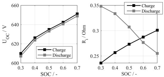 The open circuit voltage and the internal resistance are parameterized as a function of SOC. In addition, a distinction is made as to whether the battery is being charged or discharged (see Figure 6).