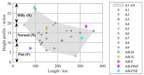 The height profile and the cycle length of the used driving cycles are put into perspective with the available Autobahn sections in [30], as shown in Figure 7. The unit of the height profile is the cumulative meters of altitude covered (uphill and downhill) per kilometer driven. The driving cycles used for this investigation cover the range of height profiles and distances of the respective Autobahn sections well. The speed and slope profile of the three training cycles can be found in the Appendix D.