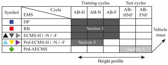In this section, the three basic EMSs and their application for HEV-HD trucks are described. In the first step, the RB and DP are described and the difference in the operating strategy is explained. The application of the ECMS is carried out by a grid iteration to identify the basic EF. The results from this basic investigation are the ECMS-H, ECMS-N and ECMS-F, as shown in Figure 8. These EMSs are specifically tuned for the training cycles, which is indicated by the last letter referring to the height profile. Based on the insights from Section 3, a predictive battery discharge (PBDis) function is developed in Section 4. Here, the focus is on the training cycles with distinct height profile. In Section 5, the predictive EMSs are extended by an adaptive feature and combined in one functional structure. The resulting Prd-AECMS is investigated on the test cycles to evaluate how well the operating strategy is adjusted to the changing boundary conditions. A final comparison of the Prd-AECMS with the other EMSs is carried out for all cycles and different vehicle masses and is described in Section 6.