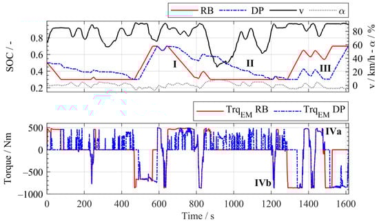 The application of the DP regarding the optimal control problem of HEVs is based on the open-source DPM function [31]. For details regarding problem formulation, see Ref. [5]. The DPM function was adjusted to the described vehicle model in Section 2. To emphasize the difference between the global optimal solution and the heuristic approach, the corresponding SOC trajectories are plotted in Figure 9. The top graph shows the SOC trajectories, the vehicle speed, and the road slope. In the bottom graph, the corresponding torque of the electric machine is plotted. The immediate discharging of the battery by the RB can be observed in the SOC trajectory (I). In contrast to that, DP depletes the battery over a long period of time (II) so that the battery is depleted just before the next downhill section where the complete DoD of battery is recharged. A recharging of the battery by the means of a load point shift would conflict with the slow discharge of the optimal control solution and is therefore neglected in this study. A third observation is the delayed recuperation of the DP (III), which is only possible due to the a priori knowledge.