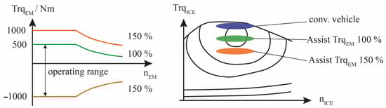 The different magnitude of torque during propulsion and recuperation is explained in Figure 10. Even if the electric machine can deliver a peak power of up to 110 kW, it is only operated within the continuous power limit of 70 kW during propulsion (IVa in Figure 9). The impact of this imposed limitation can be explained by the operating points of the combustion engine. An assist mode with peak power would lower the operating point below its best point. In recuperation mode, the peak power is applied (IVb in Figure 9).