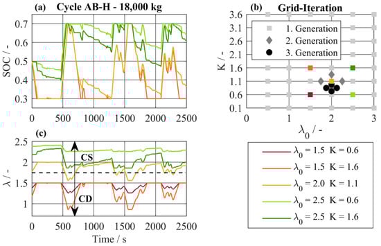 To identify a basic parametrization of the dynamic EF for the investigated HEV-HD truck, a grid iteration is used. The ECMS is based on the approach according to (19). The reference SOC is set to the minimum value of 30% to ensure an empty battery before long downhill driving phases. The used grid iteration and the resulting operation strategy of different parameter sets are displayed in Figure 11. The covered parameter range of and is shown in Figure 11b. During the first iteration, the whole range of parameter sets is simulated on the training cycles. The resulting equivalent fuel mass is used to find the optimal parameter set. Around this optimal parameter set, a second iteration is carried out, and so on. The resulting operation strategy of five different parameter sets is shown in Figure 11a in the form of the SOC trajectories. The corresponding trajectories of the dynamic EF are plotted in Figure 11c. It can be observed that a value of below 2 leads to a CD operating strategy, while a value above 2 leads to a CS operating strategy. In the latter case, the SOC does not drop below a value of 50%. While the basic EF determines the type of operating strategy, the K-values determine the characteristics of the operating strategy. A low value of K leads to a slower battery discharge than a high value. The final parameters for the three training cycles confirm the observed impact of the EF. The hilly driving cycles require a CD operating strategy with a of 2, while the flat driving cycle requires a CS operating strategy with a of 2.5 (see Appendix B).