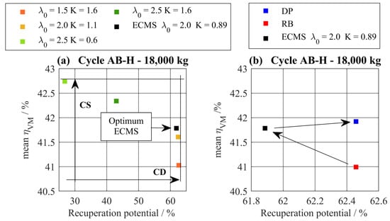 The impact of the different parameter sets regarding efficiency is plotted in Figure 12. To gain the optimal powertrain efficiency, the tradeoff between the recuperation potential and the average efficiency of the ICE must be solved. The recuperation potential is the amount of recuperated energy in relation to the available brake energy at the input shaft of the gearbox. In Figure 12a, the last grid iteration is plotted in comparison to the parameters set from the first iteration. A CS operating strategy leads to high efficiency of the ICE but low recuperation potential. A CD operating strategy leads to high recuperation potential but low average ICE efficiency. In Figure 12b, the ECMS is compared to RB and DP. It can be observed that the RB leads to the maximal recuperation potential due to the immediate discharge of the battery. This, however, leads to the lowest mean efficiency of the ICE. The local optimization of the ECMS leads to improved mean efficiency but reduces the recuperation potential. The DP represents to the global optimum in both directions. The aim of the proposed intelligent EMS is to replicate the operating strategy of the DP so that the tradeoff is solved in the best possible way without the complete a priori knowledge.