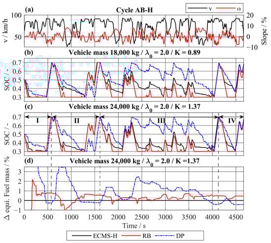 The SOC trajectories of the ECMS-H, RB and DP are compared to identify approaches which can solve the described tradeoff (see Figure 13). The analysis is done on the driving cycle AB-H with the vehicle speed and road slope plotted in Figure 13a. In Figure 13b,c, the SOC trajectories for a vehicle mass of 18,000 kg and 24,000 kg, respectively, are displayed. The cycle is divided into four periods based on the points where the battery can be fully recharged, as marked in Figure 13c. For a vehicle mass of 18,000 kg, the SOC trajectory of ECMS shows a similar operating strategy as the DP, especially in periods II and IV. In period III, the trajectories are similar but feature a SOC offset of about 20% of the usable energy. With increased payload, the operating strategy of the ECMS-H becomes more like the CD strategy of RB. The SOC offset towards DP widens as the K-value increases, which leads to a faster battery discharge. The advantage of the optimal control against the other EMSs regarding equivalent fuel consumption can be observed in Figure 13d. Until the end of period III, the RB shows better fuel consumption than the DP. The DP leads to a CS operating strategy over most of the section. The electric energy is only used during a steep hill climb at the end of the section. This flexible combination of a CS-CD operating strategy is not possible to achieve by the ECMS-H with a fixed parameter set of and . To counter this limitation, the intelligent EMS is extended by further parameters and a predictive battery discharge function prior to a long downhill section.