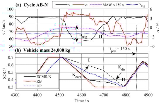 To achieve the flexible CS-CD operating strategy observed from DP, the discharging of the battery is split up in two sections. The new parameters and their intended impact within the two sections are shown in Figure 14. In Figure 14a, the speed profile and the road slope of the driving cycle AB-N are plotted. In addition to that, the Moving Average Window (MAW) of the road slope is plotted for a time of 150 s Equation (21). The value of the is used as a trigger condition to switch between the two sections with different operating strategies Equation (22). While the value of is above a defined value , a CS operation strategy is chosen. In period I in Figure 14b, a slow battery discharge is realized by the parameter which adjusts the basic value. If the value drops below the trigger condition, an immediate and fast discharge is forced upon the battery by a comparatively high value of the parameter (see period II). This extension of the ECMS is realized by the parameter which includes the case switch (23).