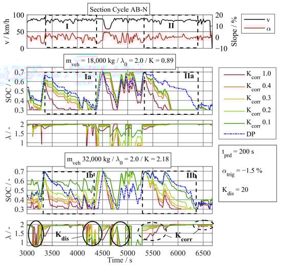 To gain a detailed understanding of the impact of the parameter , a variation in the driving cycle AB-N for two different periods and two different vehicle masses is shown in Figure 15. These two periods were selected because of their difference in the occurring height profile. In the first period, the distinct height profile with slopes of up to 5% contrasts the height profile of the second period, where the slope oscillates around 0% for the last half of the period (see I and II in Figure 15). For the first period and a vehicle mass of 18,000 kg, a value of 0.1 for leads to a similar SOC trajectory to the global optimal solution based on DP (see Ia). However, the same value for would lead to a suboptimal discharging trajectory for a vehicle mass of 32,000 kg (see Ib in Figure 15). Here, the SOC would still be at a value of 0.5 before the next recuperation phase where the battery is fully charged. This would lead to a reduced recuperation potential. Here, a value of 0.4 for imitates the discharging trajectory of the DP in the best possible way. For the second period and a vehicle mass of 18,000 kg, none of the values for lead to a similar SOC trajectory to the DP (see IIa). Here, a switch from the CD- to a CS-operating strategy is required, which is described in Section 5. For a vehicle mass of 32,000 kg, a value of 0.1 for indicates the best matching between the SOC trajectory of the DP (see IIb). However, this contradicts the optimal value observed in the first period for 32,000 kg of 0.4 (comparison of Ib to IIb). The corresponding equivalent fuel masses for the shown parameter variations are shown in the Appendix C (see Figure A2).