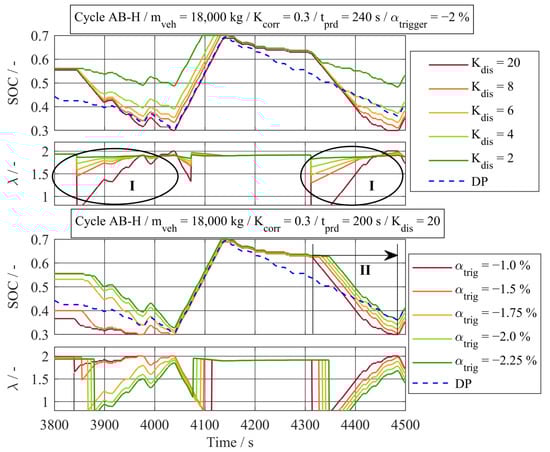 The variation in the parameters and for the driving cycle AB-H is shown in Figure 16. The cycle AB-H was chosen for this analysis as here, the two step downhill sections were close to each other. To realize a fast discharge and a good efficiency of the ICE, the parameters were tuned manually to observe possible parameter sets that imitate the global optimal solution of the DP. It can be observed that a variation of defines how fast the battery is discharged. While low values result in slow discharging, high values lead to an immediate discharge. The different discharging behavior results from the adjusted equivalence factor as highlighted (see period I). The parameter influences the distance between the downhill section and the start of the predictive discharge of the battery. As the value of functions as the trigger condition, low negative values lead to the earliest discharging of the battery (see period II). High negative values delay the predictive discharging. The parameter and the predictive horizon stand in close interdependency, as the predictive horizon defines the earliest possible point for a predictive discharging of the battery. In general, all four parameters , , and interdepend on each other. Therefore, a full factorial parameter variation was carried out to identify the optimal parameter sets regarding equivalent fuel mass.