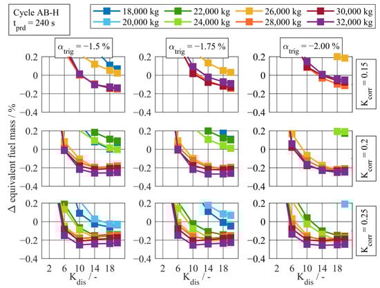 One exemplary part of this full factorial parameter variation is shown in Figure 17. As observed in the partial analysis (see Figure A2), the reduction of equivalent fuel mass is low for low values of . Additionally, it can be observed that values of 0.25 for increase the saving potential for heavy vehicles the most. The highest reduction potential for low vehicles is obtained with values of around 0.4. For the parameter , small negative values are beneficial regarding equivalent fuel consumption. This observation is only true for the driving cycle AB-H due to its distinct height profile. For the height profile of the driving cycle AB-N, higher negative values of are favorable (see Figure A2). Regarding the parameter it can be stated that values lower that 6 lead to an increase of equivalent fuel mass as the predictive discharging is too slow. Here again, the cycle AB-H requires not only an earlier but also faster predictive discharging of the battery than the cycle AB-N. For the latter, the selected values lie around 6 while the cycle AB-N requires values around 18 (see Figure A2). The final parameters for the predictive battery discharge functionality can be found in the Appendix C (see Figure A3).