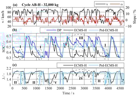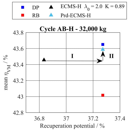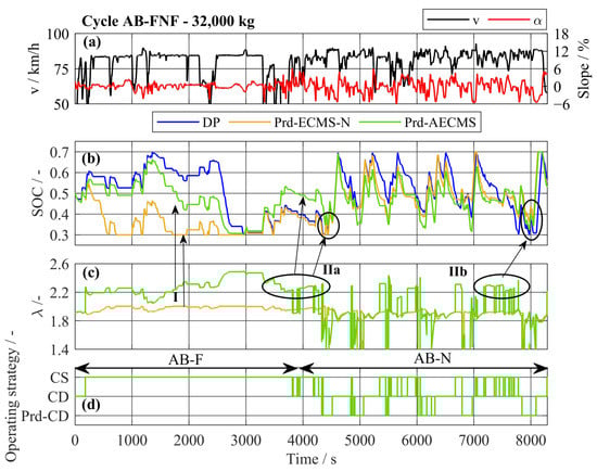 The SOC trajectory and the chosen operating strategy is displayed in Figure 24 for an extract of the driving cycle AB-FNF. In Figure 24a, the change of height profile and a corresponding change in the speed profile can be observed. While the vehicle speed is constant and the height profile is flat at the beginning (AB-F), it changes to a fluctuating height and speed profile in the section of AB-N. In Figure 24d, the chosen operating strategy of the Prd-AECMS is plotted. If a flat driving cycle is detected by the DCR, a value of 2.5 is chosen to create a CS operating strategy. If a hilly driving cycle is recognized, a value of 2.0 is selected, which leads to a CD operating strategy. A predictive discharge of the battery is labelled as Prd-CD. In Figure 24b, it is shown that the operation strategy of the Prd-AECMS leads to a similar SOC trajectory as the one of DP. The Prd-ECMS-N, which only uses PBDis but no DCR, leads to a CD operating strategy in the first half of the shown extract of the cycle AB-FNF (I). The Prd-AECMS is able to create a CS operating strategy due to switching conditions realized by the DCR. In the second half, it can be observed that the detection of the driving cycle by the DCR is sensitive. This sensitivity results in a CS operation strategy where a CD operation strategy is required. A too-late switch from a CS to a CD operating strategy (IIa) and the sensitivity (IIb) lead to a reduction of recuperation potential. Even the PBDis function cannot deplete the battery completely before the long downhill driving situation. This explains the negative impact on the recuperation potential for a high vehicle mass. The sensitivity of the DCR results from short sections of the driving cycle AB-N, where the speed profile and height profile are similar to driving cycle AB-F. A longer predictive horizon cloud reduces the sensitivity on this specific cycle. However, parameter variations have shown that a longer predictive horizon would reduce the effectiveness for a majority of other vehicle masses and cycles.