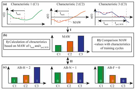 To realize a switching condition between CS and CD operating strategy, an adaption functionality is implemented based on DCR. This is based on the concept presented in [32] and was adjusted and extended for the application of long-haul highway driving. Originally, 24 characteristics of the driving cycle were defined but only considered for past driving situations. In this study, all parameters that contain the road slope (e.g., standard deviation of slope, max. slope, average slope) are also considered with a forward-looking MAW. The principle and the described extension of the DRC is shown for three characteristics of a driving cycle in Figure 20. In box (a), the speed, acceleration and slope of the cycle are sketched. To derive the characteristics of average speed (C1), average acceleration (C2) and average slope (C3) a backward locking MAW is applied. For the road slope a forward-looking MAW is added. This analysis leads to the values of the three characteristics for the considered time frame of the MAW, as shown in the box (b). For the matching of the current driving situation with one of the three training cycles, the nearest neighboring method is applied. All 24 characteristics of the current driving situation are compared to the overall characteristics of the training cycles. The training cycle where the characteristics are the closest gains a point. The cycle that scores the highest after all comparisons is allocated to the current driving situation, as shown in the bottom plot. Here, the values of C1 and C3 of the driving cycle AB-H match best to the characteristics of the current driving situation.
