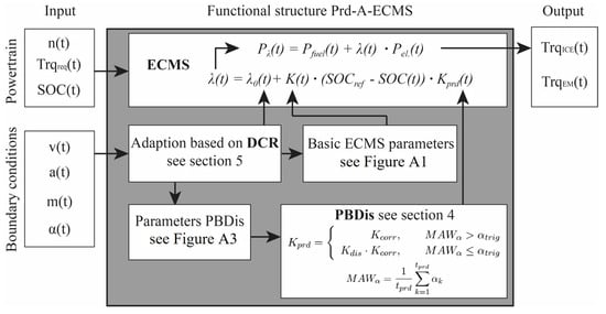The static EF is used by [9,10] to propose an adaptive ECMS where a dynamic EF factor is adjusted based on the deviation of the actual SOC and a defined reference SOC (19). This leads to a higher degree of freedom regarding the operating mode selection and is commonly referred to A-ECMS. However, in this paper, this approach is referred to as basic ECMS according to the introduced nomenclature (see Figure 8).