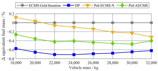 In this section, the simulation results of the Prd-AECMS are compared against the other EMSs for all driving cycles and the variation of vehicle mass. First, the fuel saving potential that is gained from the PBDis is evaluated against the basic ECMS. In a second step, the Prd-AECMS is evaluated against the Prd-ECMS-N, as this EMS is tuned for the mean height profile of the Autobahn network. By this two-stage analysis, the fuel saving potential can be allocated towards the predictive feature or the adaptive feature. In addition, the equivalent fuel mass is correlated with the boundary conditions of height profile and the vehicle mass. Finally, the Prd-AECMS is compared to the RB and the DP to quantify the fuel saving potential against the state-of-the-art and the global optimal solution.