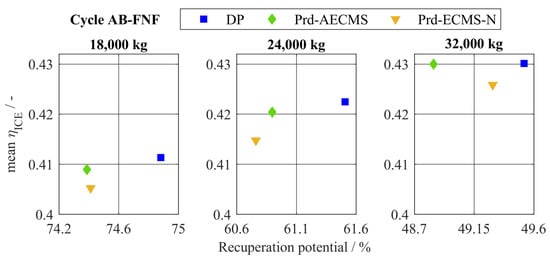 To investigate the effectiveness further, with focus on the highest vehicle mass, the tradeoff between average efficiency of ICE and recuperation potential is analyzed. The different EMSs are scattered within the state space of the tradeoff for three different vehicle masses as shown in Figure 23. For the vehicle masses of 18,000 kg and 24,000 kg, the Prd-AECMS can improve the average efficiency compared with the Prd-ECMS-N. As both EMSs are using the PBDis, the recuperation potential is almost the same. For a vehicle mass of 32,000 kg, the recuperation potential of the Prd-AECMS is the worst out of the three compared EMS. This could be caused by a negative effect of the combination of DCR and PBDis. Such a negative effect could be due to the usage of a suboptimal operating strategy due to an overly sensitive adaption. To identify the reasons for that negative impact, the SOC trajectories are analyzed in the next paragraph.