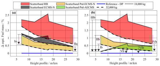 The fuel saving potential resulting from Prd-AECMS is plotted as a scatter band in Figure 25b. It can be observed that the addition of the DCR and its possibility to adapt the operating strategy has no impact on driving cycles with a distinct height profile. A switching between CS and CD operating strategies is not required as the vehicle is operated mainly with a CD operating strategy due to the distinct height profile. The impact increases with a flattening of the height profile. For flat driving cycles, the Prd-AECMS leads to a fuel saving potential of 1% (IIb) and 0.5% (Ib) compared with the Prd-ECMS-N for a low and high vehicle mass, respectively. Compared with the RB, a total fuel saving potential of 2% (IIIb) can be achieved for a low vehicle mass. For a distinct height profile and a high vehicle mass, the Prd-AECMS still leads to 0.5% (IVb) fuel saving compared with RB. The reduced fuel saving potential for a distinct height profile and a high vehicle mass results from a different load spectrum of the ICE. The increased power demand shifts the operating points of the ICE close to, or even above, the sweet spot regarding efficiency. The advantage of the optimization-based EMS diminishes in these regions of operation, as shown in [25]. A final comparison of the Prd-AECMS against DP shows that only 0.3% (Vb) further fuel saving potential is achievable for high vehicle masses. Even for low vehicle masses, the DP performs only 0.5% better (VIb).