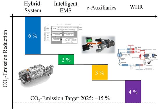 The identified fuel saving potential by an intelligent EMS under real driving conditions is valuable knowledge regarding future HD trucks that need to achieve lower CO2 emissions. The fuel saving potential of possible powertrain efficiency measures are plotted in Figure 26. While a hybrid system itself can lead to a fuel saving potential of 6–8% [33,34], an intelligent EMS can add up to 2% fuel saving. Further fuel saving measures such as e-components and a waste heat recovery (WHR) system can add another 3% [35,36] and 4–5% [37,38], respectively. The design of the powertrain and auxiliaries itself is of significance, as well as the control of the powertrain, as documented in [39,40]. The 2025 CO2 emission reduction target of 15% can only be achieved by a combination of all measures. However, the potential of these measures depends on the application and therefore can vary.