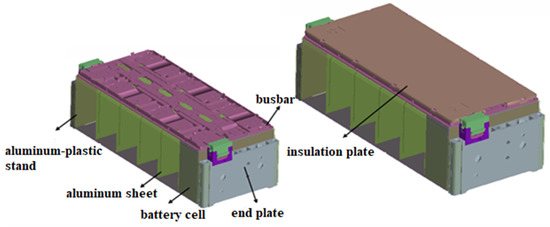 The six-cell LIB modules employed in this study are illustrated in Figure 1, and included commercial prismatic Li(Ni0.6Mn0.2Co0.2)O2/graphite LIBs, an aluminum-plastic stand, a busbar, an aluminum sheet, end plates on both sides, and upper and lower insulation plates. The individual LIBs employed in the modules had dimensions of 54 mm × 145 mm × 95 mm, charge-discharge capacities of 104 Ah, and nominal voltages of 3.75 V. The key parameters of the resulting LIB modules are listed in Table 1.