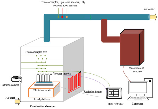 The experimental setup used to assess the thermal runaway (TR) propagation characteristics of the lithium-ion battery (LIB) modules is depicted in Figure 3. The test system primarily consists of a combustion chamber, a 400 W radiative heater, an array of vertical-gradient thermocouples to measure the center temperature of the fire plume, a smoke/gas vent system equipped with thermocouples, pressure sensors, and O2 concentration sensors, and a gas analyzer for independent measurement of CO and CO2 concentrations. The heater was positioned 30 cm away from LIB1 to initiate TR propagation. A data collector was incorporated into the system to capture real-time signals from thermocouples, voltage sensors, and an electronic scale, which provide information on the fire plume temperature, thermal field of the module, LIB voltages, and module mass, respectively. Additionally, an infrared camera recorded the real-time temperature distribution of the LIB module. The smoke/gas generated in the combustion chamber were expelled using an exhaust fan at the vent inlet, and the exhaust gas passed through a particle filter before entering the gas analyzer, which transmitted its data to a computer. The smoke/gas vent system also included an anemometer to detect the direction of gas flow in the vent tube. The thermocouple array used to measure the fire plume temperature consisted of a bundle of 30 armored thermocouples spaced vertically at 10 cm intervals above the insulation plate of the LIB module, with a horizontal spacing of 5 cm.
