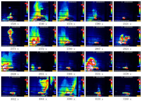 Representative infrared imagery shows the progression of thermal runaway (TR) as Figure 4, and the initial release of smoke/gas at 1526 s. The highest recorded flame temperature reached 134.1 °C. At 1540 s, a jet fire occurred, followed by the formation of a second jet flame at 1574 s. At 1580 s, two flames were observed, accompanied by flying sparks. The flame temperature then significantly decreased until 2121 s. A second smoke/gas release event occurred at 2371 s, demonstrating typical eddy and entrainment behavior. At 2372 s, two flames simultaneously formed and continued to burn stably until 2390 s, with subsequent temperature reduction until 2807 s. A third smoke/gas ejection event occurred at 2924 s, accompanied by three flames. At 2928 s, the smoke underwent deflagration, reaching a maximum temperature of 570 °C. The module entered a stable burning period at 2931 s, with a maximum temperature of 931.5 °C, followed by temperature reduction until 3466 s. The same sequence of smoke/gas ejections, flame eruptions, stable combustion, and temperature decrease occurred twice more starting at 3475 s and 4064 s. Finally, the module entered a cooling stage, with the temperature decreasing to 333.3 °C at 7260 s.
