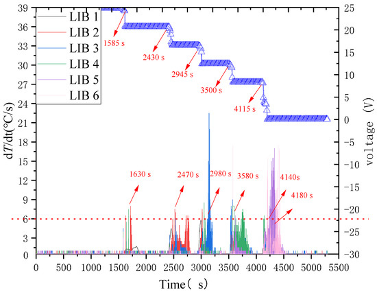 Derivatives of the LIB temperatures in Figure 5 with respect to time (dT/dt) and Voltages of each LIB are plotted for comparison.