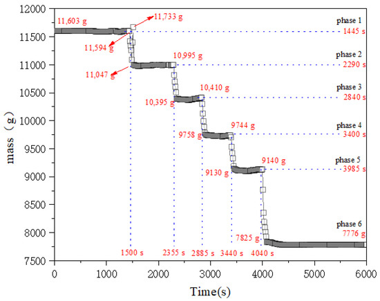 The mass of the LIB module observed during the TR process is plotted as a function of time in Figure 7. It is evident that the mass of the module also shows a stepwise decrease, corresponding to the propagation of TR. The mass losses of 585 g, 600 g, 665 g, 621 g, and 1284 g occurred over five rapid declining steps from 1445 s to 1500 s, 2290 s to 2335 s, 2840 s to 2885 s, 3400 s to 3440 s, and 3985 s to 4040 s respectively. The durations of these five steps were 55 s, 55 s, 45 s, 40 s, and 55 s, and the corresponding mass loss rates were 10.64 g/s, 10.91 g/s, 14.78 g/s, 15.53 g/s, and 23.34 g/s respectively.