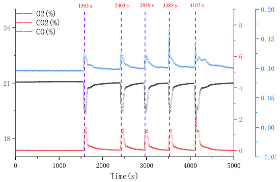 The gas produced by the oxidation reaction of smoke primarily consists of CO and CO2, which is reflected in the curves showing five peaks accordingly. While the background level of CO2 was typically very low, it increased by 1.5 vol%, 1.4 vol%, 1.4 vol%, 1.4 vol%, and 2.1 vol% at these reaction events. In contrast, the background level of CO was generally high, with the CO concentration increasing by 0.13 vol%, 0.13 vol%, 0.13 vol%, 0.17 vol%, and 0.15 vol% at these reaction events. Therefore, the production of CO2 by volume was generally greater than that of CO.
