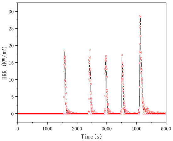 The experimentally obtained gas concentration values presented in Figure 8 were used in Equations (5)–(7) to calculate the Heat Release Rate (HRR), and the resulting HRR values are plotted in Figure 9 as a function of time. It is evident from the graph that there are five distinct peaks in the HRR curve, corresponding to temporal points of 1470 s, 2320 s, 2860 s, 3430 s, and 4010 s as shown in Figure 8. These peaks have HRR values of 18.4 kW/m2, 18.7 kW/m2, 16.8 kW/m2, 13.7 kW/m2, and 27.3 kW/m2, respectively. Notably, the fifth gas jet resulted in the highest HRR peak value due to the simultaneous failure of LIBs 5 and 6, which generated a significant volume of smoke. The relatively lower HRR peak value of the fourth gas jet can be attributed to the significant increase in CO concentration by 0.17 vol% during that reaction event (Figure 8). This increase was caused by the high temperature peak observed in LIB 3 (Figure 6) following the third smoke/gas ejection event.